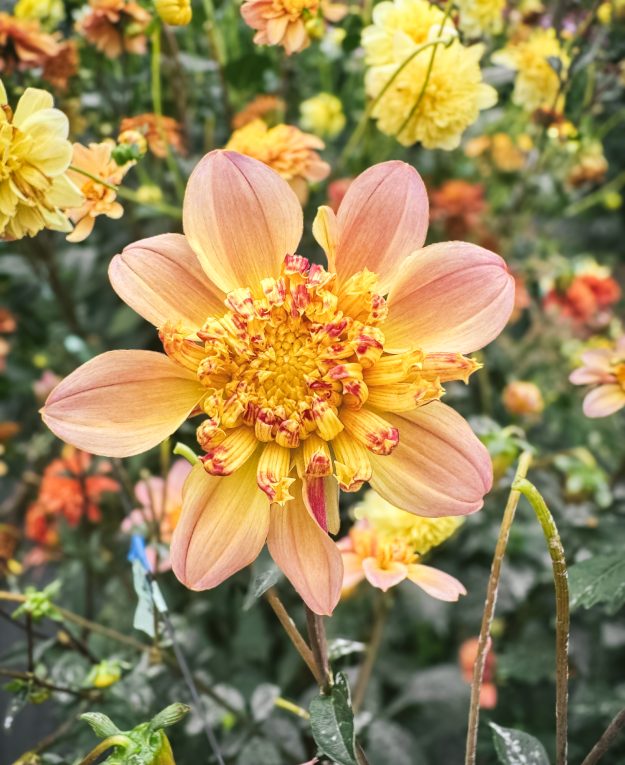 Enhance your floral arrangements with the vibrant Firetail Coral Reef dahlia. With indulgent warm hues ranging from orange to pink, this small (12 to 16cm) anemone-flowered dahlia adds a touch of colour and texture. It grows between 60 and 100cm in height. Seed parent was Christie Promise.